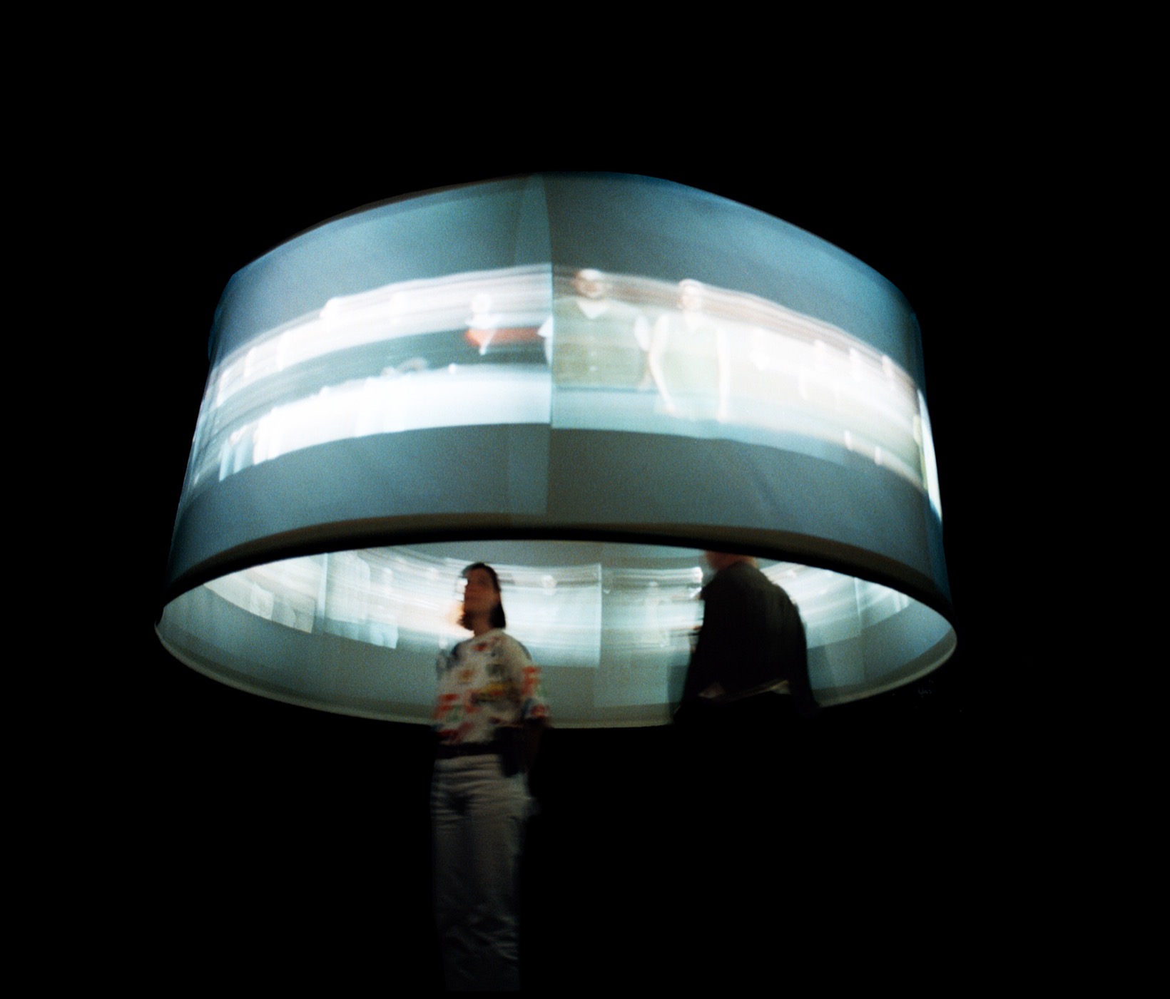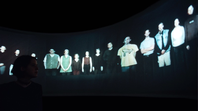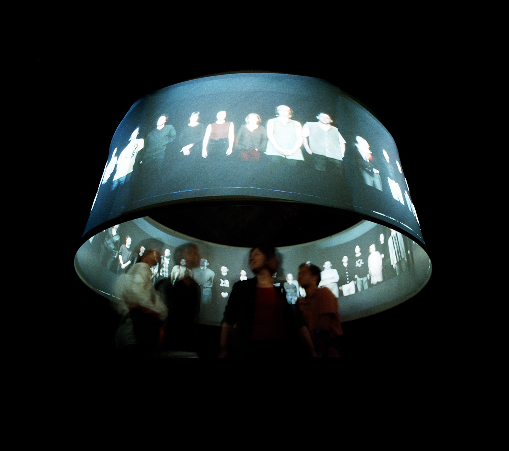 (...). The video “KreisLauf” (Circulation) is projected externally onto a semi-transparent, cylindrical screen, which is suspended from the ceiling at approximately eye-level. Thus, the images can be seen both inside and outside of the screen’s corpus. One after the other, fifty people appear on the screen and take up positions forming a complete circle. During this, they seem to make eye-contact with the observer. When an observer stands inside the circle, he or she becomes the focus of their voyeuristic interest. If the observer’s position is outside the circle, it is the space surrounding the cylinder that the film protagonists fix with their eyes. In this video work, too, Aurelia Mihai opens a window on a space; however, it is not two-dimensional as in “PlattForm“, but a three-dimensional walk-on stage. Analogous to their physical performances, the observers are assigned different positions in space – inside or outside, centre or periphery. Finally, the video images of the circle of on-lookers begin to rotate faster and faster until they dissolve into a flickering band of colour, thus breaking up the constructed relations of view and space. (...)