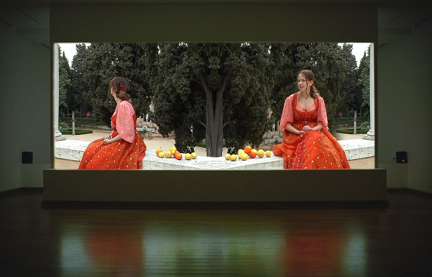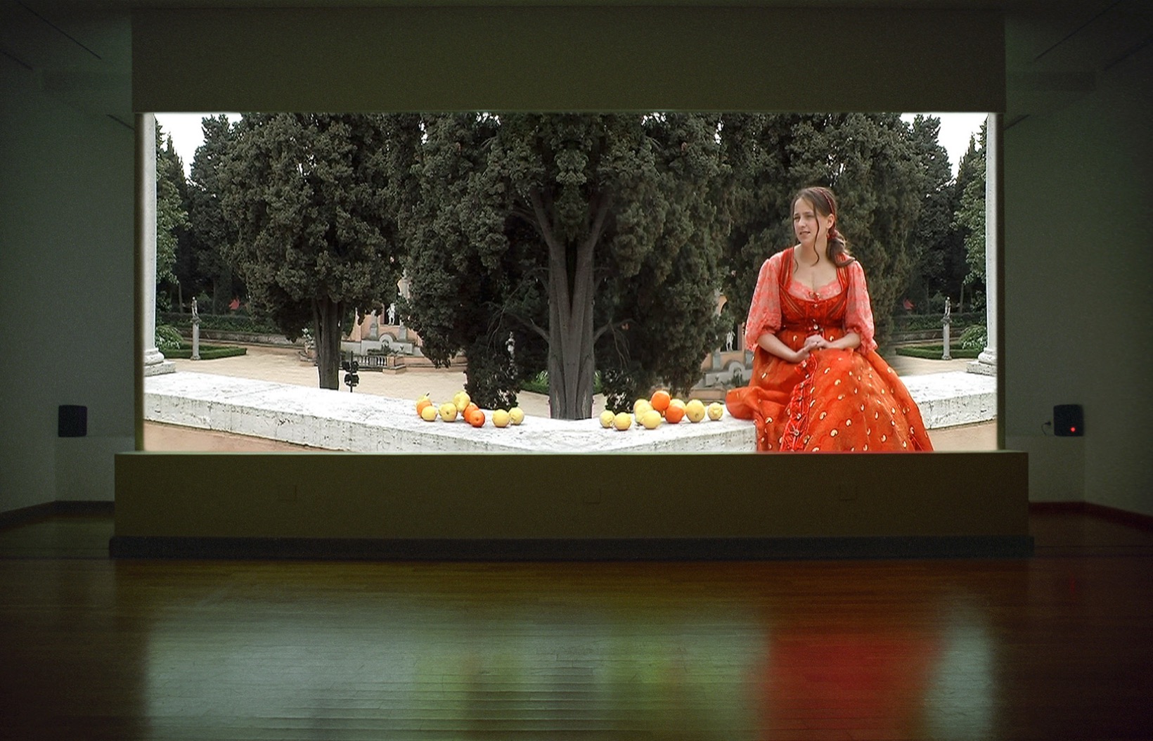 A pretty young woman in an immaculate Mediterranean garden: in concise words she describes the simply unbelievable events of her young life – about how she had cancer as a child, and a heart transplant when she was only nineteen years old. “When I was five years old, no four, I got cancer...”. Already her first sentence betrays nervousness and strain, yet outwardly the young woman looks completely calm and unscathed. As an actress playing herself, who not only tells her story, but literally embodies it, she wears the fantastic costume of a Renaissance princess. The fairytale costume cloaks a body racked by the illnesses mentioned in the video, yet at the same time the billowing material of the dress also accentuates the body, embracing it like a treasure, like a frame. Only by looking very closely can one discern the vertical scar on the breastbone left by the heart transplantation surgery. As though it had fallen there by chance, a strand of hair points exactly at the scar, which marks the culmination point of her medical history – the heart transplant of only two years ago.